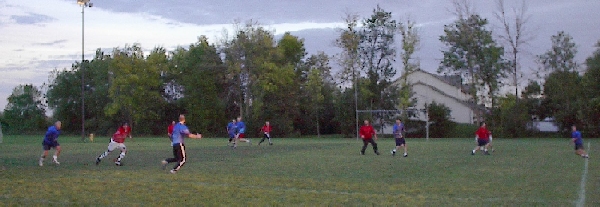 We play a light one hand touch game, to minimize arguments and injuries. We play with who ever can make it to the field, so regular participation is not a requirement. Sides are chosen at game time, and may be rearranged to even them out. We are there for fun, not to take each other out (except for a stop at a bar afterwards). 3 second delay rush (counting "One chimpanzee, Two ...") with some limited blocking. Any attempt to run negates the delay rush. We switch quarterbacks about every series, so everyone gets to throw. Be prepared to run a lot, it tends to be a heavy passing game. QBs call their plays. Everyone gets a chance a every position, including QB. We get creative. Double passing allowed, if first pass is behind the QB. A single first down can be obtained at mid-field. Fumbles are dead balls - and belong to offense. So there is no piling on. we aren't wearing any headgear and don't want to send guys to the hospital on a stretcher every week. Tentatively our season will start on the first Friday after the first week of the regular NFL season games have started, and runs to the last Friday before Thanksgiving. We are currently playing at Prairie Park in Waukesha. (under the lights). Waukesha Park & Rec. charges us $15 per hour for field time and $10 per hour for the lights. That's $50 a night for a 2 hour game. I will have to charge $5 a head for to cover field costs, and hopefully we get 10 or more players, each week. Our mesh jersey's are paid for, the colors are red & blue. If players want may bring something in those colors (Wis. Badger or Buffalo Bills jerseys for example) they are welcome. (Disclaimer: It should be noted that I have never indicated that GE stands for the company of that name. Perhaps it just stands for Good Enough...would that get by the lawyers?)